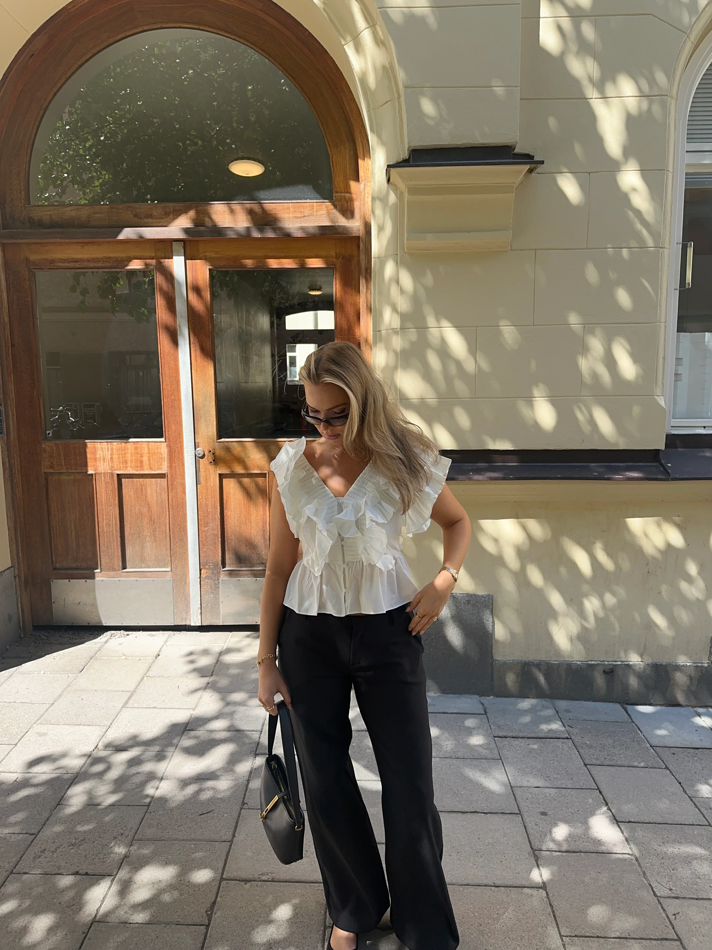 The Lia top in white is a feminine and elegant top with beautiful, voluminous ruffles on both the front and back, which really make it something special. It has a deep V-neckline and delicate, small decorative buttons in the middle, adding an extra decorative touch. An elegant and airy top that elevates any summer look 🤍