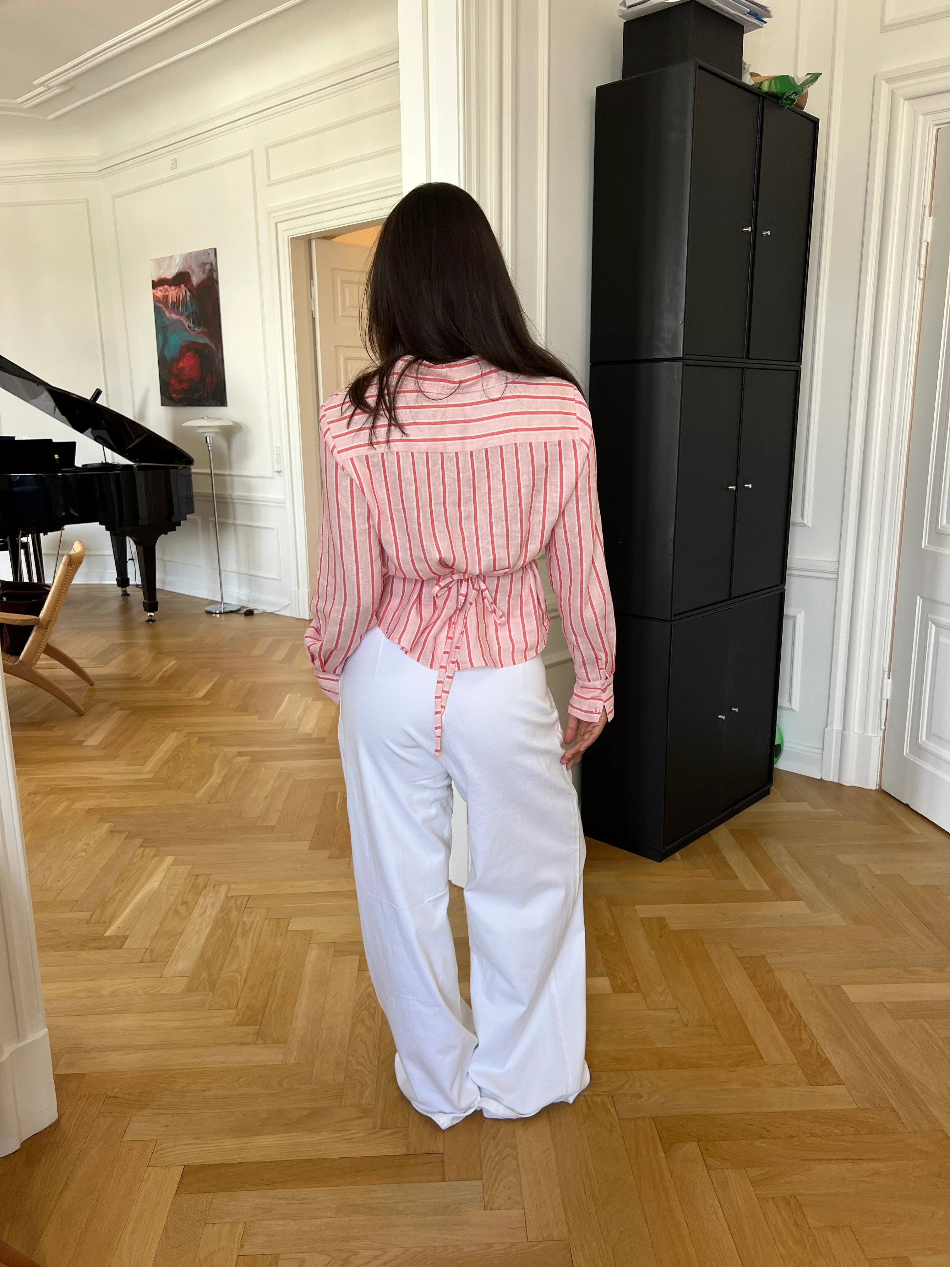 The Liora shirt is a light and airy linen shirt with delicate pink stripes on a soft pink background. It has buttons down the front and a classic collar at the neck, giving it a simple and stylish look. The shirt has a tie belt, which gives it a cute little twist and makes it extra special. Perfect for warm days when you want to be both relaxed and smart.